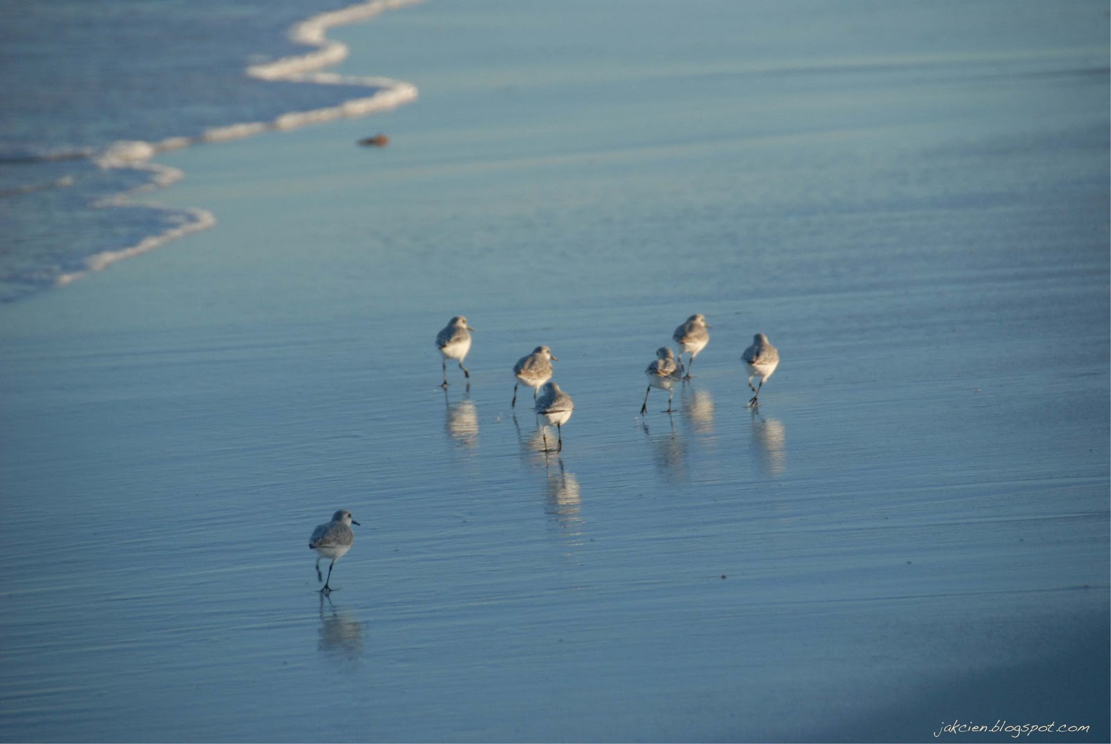 Siedziałam na plaży, ciepły, biały piasek przesypywał się pomiędzy palcami. Przez sandały i słońce na stopach pozostały białe paski. Morski wiatr miękko głaskał moją twarz i bujał żyrandolami z palmowych liści w plażowej restauracji. Słońce już zachodziło i na niebie powoli pojawiały się nowe kolory. Morze szumiało cichutko. Delikatne fale co chwilę uderzały o brzeg, goniąc stada drobnych sieweczek. Ptaszki wyglądały jak koraliki z zerwanego sznurka, które toczą się po plaży. Na cieniutkich nóżkach podskakiwały radośnie i wyjadały coś swoimi cieniutkimi dzióbkami, takie ptaszki-śmieszki. Ich odbicia pokazywały się w lustrze wody i znikały równie szybko jak fala liżąca brzeg.