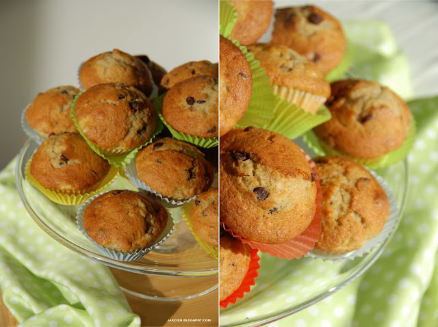 Dworce to kwintesencja podróży. Te nowoczesne zachwycają a te stare budzą podziw i wyobrażenia tego jak wyglądały przed laty. Wielkie hale dworcowe przywodzą mi na myśl moje minione podróże. Przypominają mi się: paryski Gare du Nord, dworzec Keleti w Budapeszcie, Hauptbahnhof w Berlinie albo w Kolonii. Przypomina mi się też dworzec w Muenster, z którego kiedyś w piątki, regularnie wyruszałam pociągiem na weekend. Wprawdzie nigdy nie był to tak długi weekend jak ten który właśnie się rozpoczął ale zawsze w dworcowym sklepiku kupowałam obowiązkowo: owocowe smoothie, kawę i pysznego muffina na drogę. Wsiadałam do wcale nie byle jakiego pociągu i zagłębiałam się w lekturze albo ze słuchawkami na uszach wpatrywałam się w zmieniające się za oknem krajobrazy. Odtąd kawa i ciastko jest moim pociągowym, podróżnym rytuałem. Na drogę zabieram najchętniej muffina, może być z czekoladą i bananami. Piecze się szybko a zamiast czekoladowych groszków można dodać posiekaną, gorzką czekoladę. Do tego pasuje jedynie kubek mlecznej kawy. Zamykam mieszkanie i weekendowa wycieczka rozpoczęta.