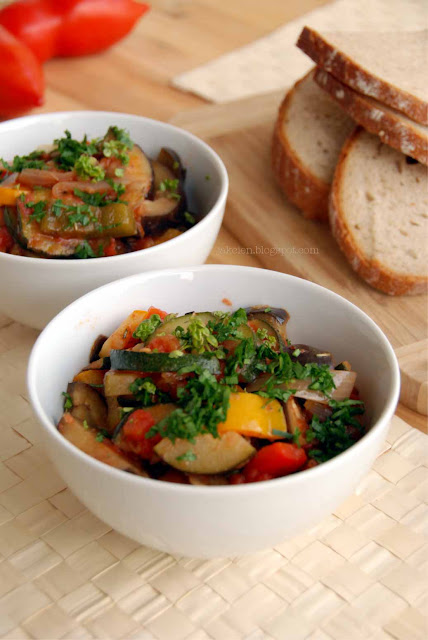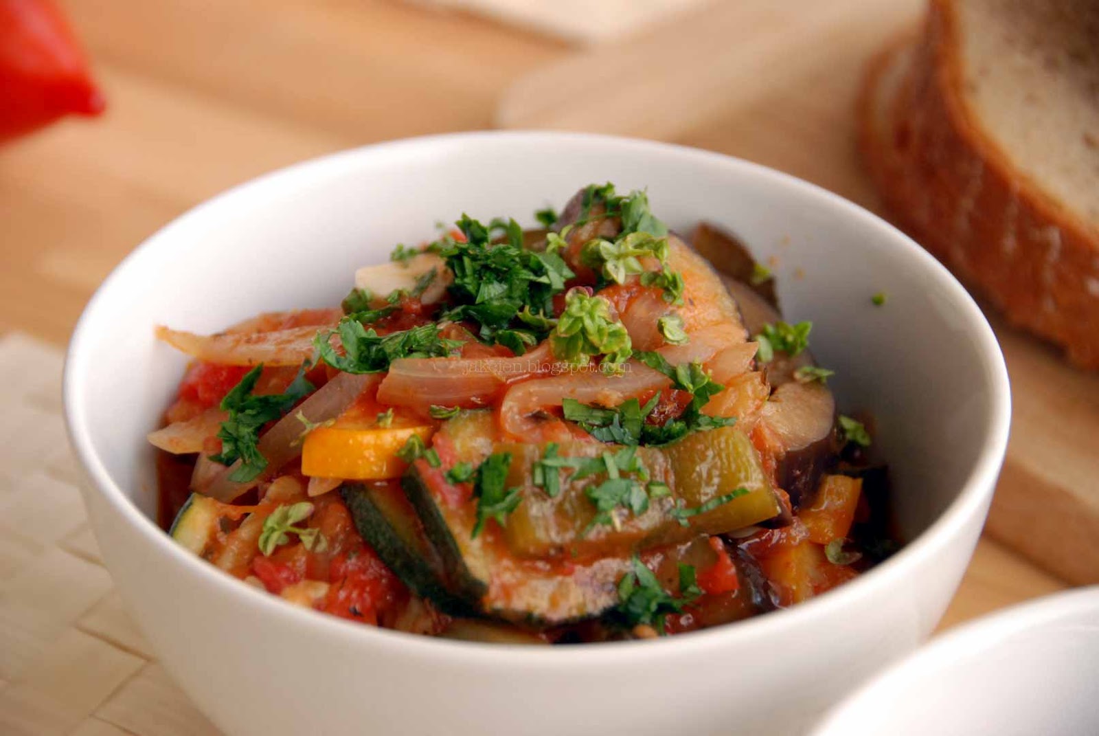 Bakłażana pokroiłam w plastry grubości około pół centymetra, posypałam solą i odstawiłam na około 15 minut. Gdy pojawiły się na nich kropelki rosy, wytarłam je ręcznikiem papierowym i przekroiłam każdy plaster na 4 ćwiartki (dzięki soli pozbyłam się bakłażanowej goryczki). Na patelni rozgrzałam kilka łyżek oliwy z oliwek i obsmażyłam kawałki bakłażana, aż lekko się zrumienił (musi być już prawie miękki). Przełożyłam go później do dużego rondla (o pojemności około 3 l) i odstawiłam na bok. Na patelni obsmażyłam też kabaczka ze skórką, pokrojonego w małe plasterki. Dzięki skórce kabaczek pozostał chrupki i nie rozpadał się w gotowym daniu. Tak samo postąpiłam z cukinią i  papryką, oczyszczoną z gniazd nasiennych, obsmażałam je tylko nieco krócej. Na koniec na patelnię wrzuciłam cebulę pokrojoną w piórka, oliwę uzupełniałam w miarę potrzeb. Cebulę dusiłam do zrumienienia. Po usmażeniu cebuli na patelni podsmażałam czosnek pokrojony w cieniutkie plasterki. Gdy tylko uwolnił swój aromat dodałam do niego obrane ze skórki i pokrojone w kostkę pomidory. Wszystko posoliłam, posypałam ziołami prowansalskimi, wkruszyłam suszone chili a następnie dusiłam aż pomidory utworzyły gęsty sos i nieco zredukowały swoją objętość. Pomidorowym sosem zalałam przesmażone warzywa w rondlu i dusiłam całość od czasu do czasu delikatnie mieszając. Doprawiłam do smaku już tylko solą i pieprzem gdy warzywa były całkiem miękkie. Podawałam posypane świeżą natką pietruszki, udekorowane ziołami z białym pieczywem.