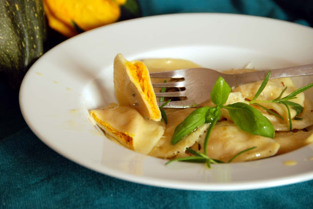 Moje dzisiejsze mają formę tradycyjnych pierogów, ale smakują tak samo jak tortelli z dynią i ricottą. Podaje się je z sosem maślanym i świeżymi ziołami: rozmarynem, szałwią i bazylią. W domu robiłam je już z dynią makaronową i bardziej wyrazistą hokkaido. Polecam obie, choć dynię makaronową trzeba długo redukować, aby farsz nie był zbyt płynny.