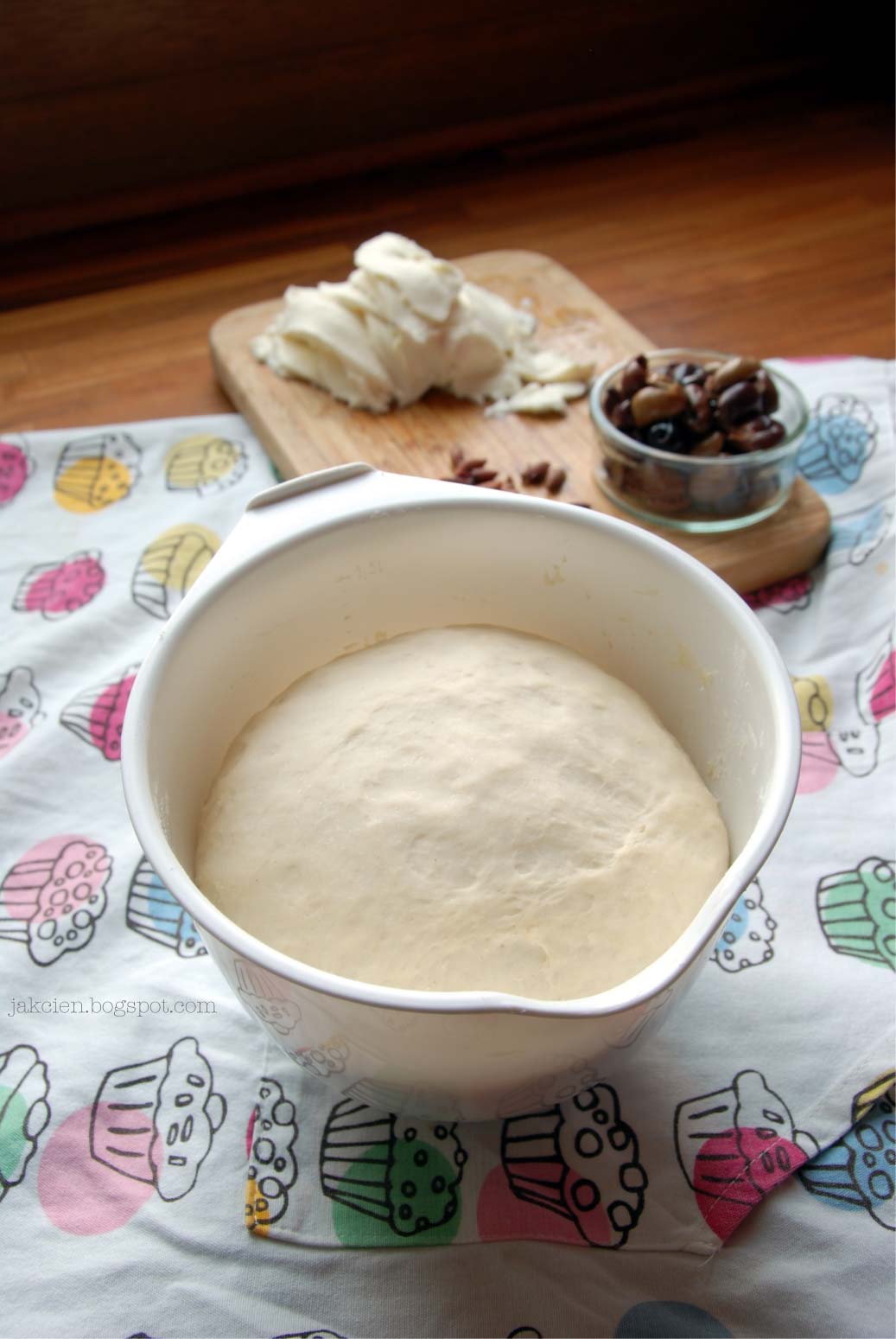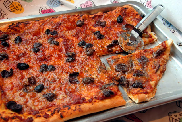 Po wyrośnięciu, czyli po około 30 minutach ciasto jeszcze raz zagniatam, aby uwolnić pęcherzyki dwutlenku węgla, który powstał w procesie wyrastania. Wtedy wałkuję ciasto cieniutko i układam na blaszce wysypanej warstewką mąki. Nie pozwalam aby ciasto wyrosło po raz drugi, wtedy pizza zostaje cieniutka (wyrasta jeszcze nieco w piekarniku). Brzegi ciasta smaruję oliwą. Na środek rozkładam przestudzony sos, mozzarellę pokrojoną w cieniutkie plasterki i oliwki, które wcześniej pozbawiam pestek (moją pizzę przed upieczeniem widać na ostatnim zdjęciu). Piekę w dobrze nagrzanym piekarniku (220 stopni) przez 30 minut. Przez ostatnie 10 minut używam funkcji grzania z góry aby ser się ładnie rozpiekł, a brzegi się lekko zrumieniły. Czas pieczenia zależy od tego jak bardzo rozwałkowane jest ciasto. Spód pizzy powinien być lekko chrupiący ale ciasto na brzegach powinno zachować puszystość.