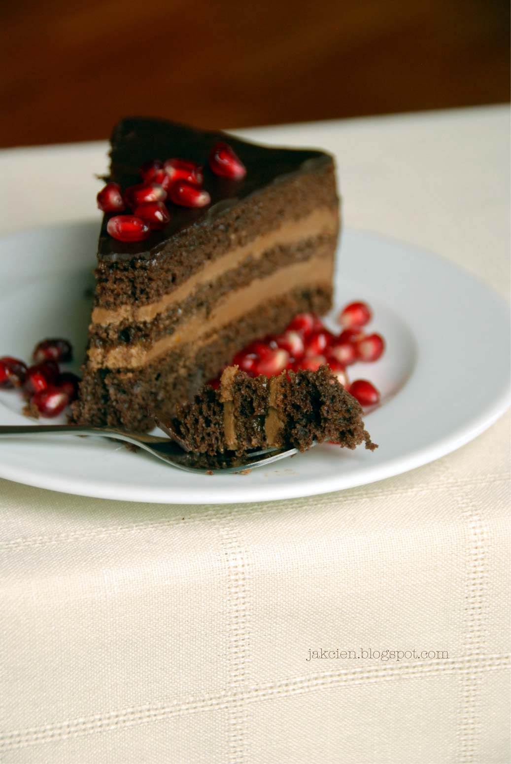 Dziś proponuję tort na Nowy Rok. Taki słodki pocieszyciel po kolorowych Świętach i hucznych zabawach. Nie będę nikogo oszukiwać, że przygotowuje się go szybko i łatwo. Nie jest to jednak najtrudniejszy z tortów jakie przyjdzie Wam upiec. Do przygotowania kremu użyłam półproduktu, kremu kajmakowego. Biszkopt dobrze nasączyłam brandy i zamknęłam całość w czekoladowej polewie. Bez zbędnych dekoracji, tort broni się sam. Koniecznie w towarzystwie kwaskowego owocu granatu, który jest moim zimowym przebojem zarówno w wersji owocu jak i soku. Ma dużo witaminy C a do tego świetnie komponuje się z czekoladą, smakowo i kolorystycznie.