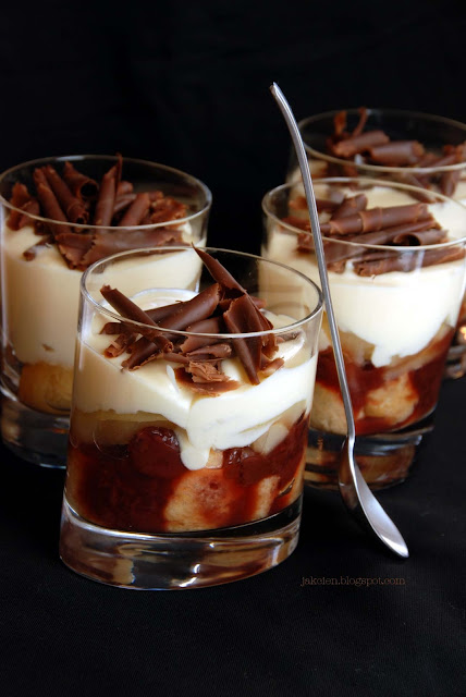 Dzisiejszy przepis zanotowałam kiedyś w kalendarzu. Teraz, robiąc porządki, sobie o nim przypomniałam. Jeśli wcześniej ugotujecie budyń, to przygotowanie deseru zajmuje już tylko 15 minut i nie wymaga pieczenia. Smakuje wyśmienicie, polubi go każdy, nawet jeśli nie jest wielkim amatorem gruszek. Delikatne biszkopty nasączone rumem, słodkie czereśnie i gruszki a na koniec warstwa waniliowego kremu z wiórkami czekolady.