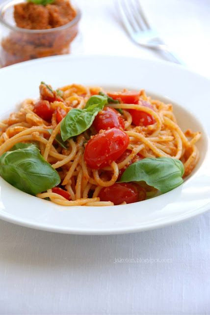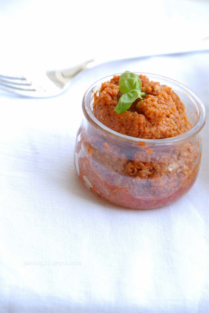 3. Myślę, że każda włoska gospodyni domowa ma swój przepis na pesto sycylijskie. Moja wersja jest zmodyfikowana o tyle, że zwykle nie łączy się pomidorów świeżych z suszonymi a pesto powstaje na bazie wyłącznie oliwy z oliwek. Ponieważ częściej mam do dyspozycji pomidory suszone z olejem a nie oliwą to właśnie takie dodaję do pesto. Czasem łączę je jeszcze z pomidorkami koktajlowymi.