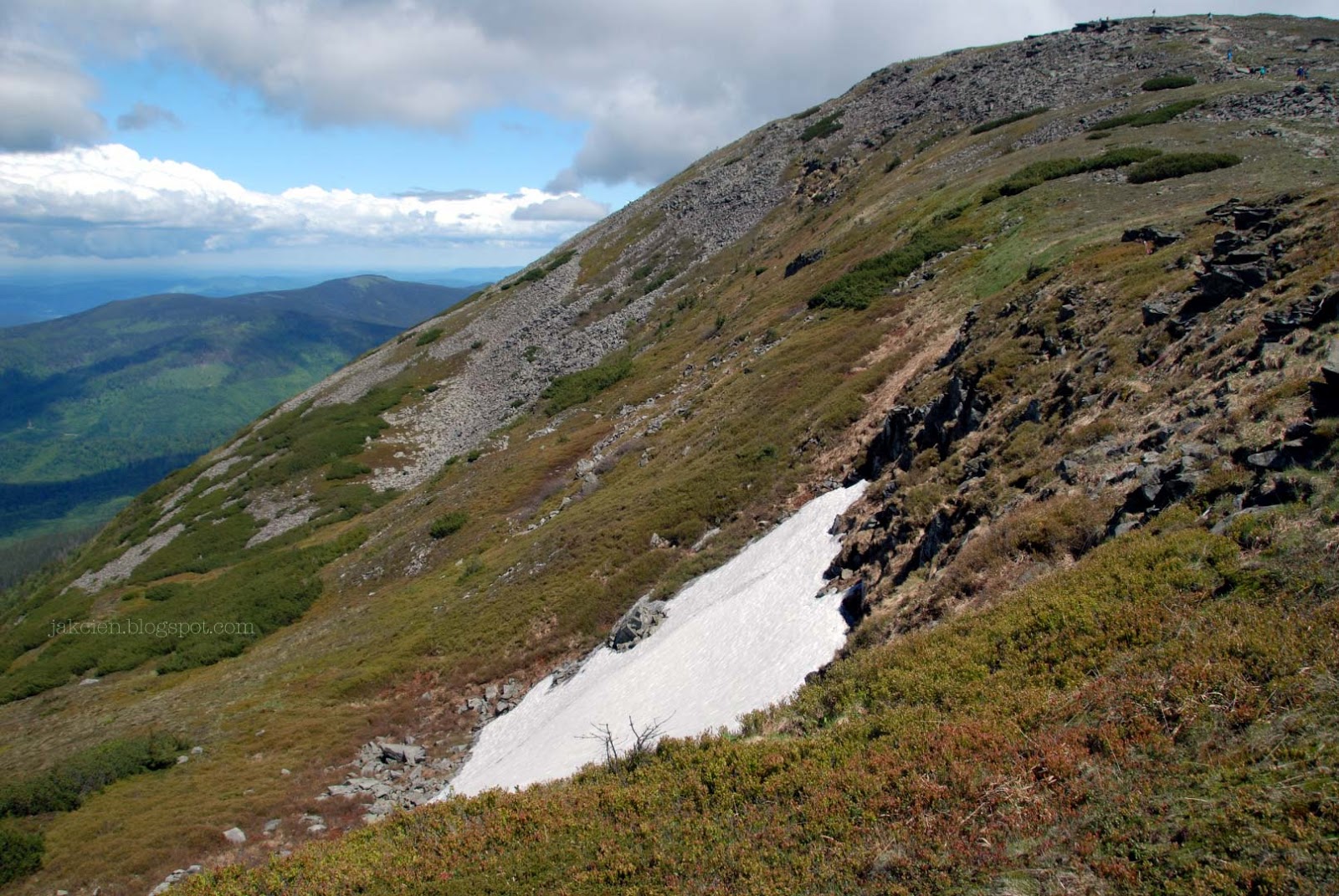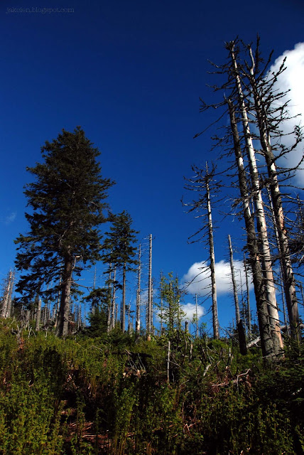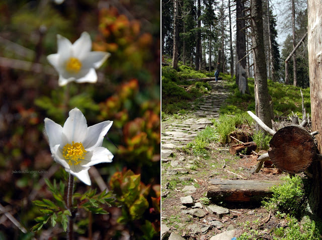 Wiosna w górach przychodzi trochę później niż na nizinach. W ostatnich dniach maja na szlakach było zadziwiająco pusto. Mało wytrwałych odstraszyła pogoda. Spadł jednak tylko lekki deszcz, dzięki któremu w lesie pachniało mokrą ziemią i czosnkiem niedźwiedzim. W wilgotnym powietrzu zapach unosił się dalej niż zwykle. Jagodowe krzaczki obsypały się różowym kwieciem. W nieśmiałych promieniach słońca świat wygląda jednak zupełnie inaczej.