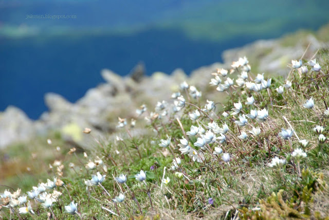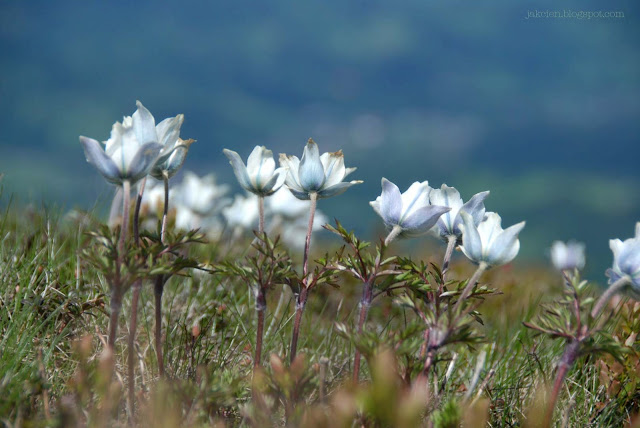 Na szczycie Babiej Góry kwitły sasanki, cała masa. Hulał silny wiatr. Białe kwiatki ledwo wytrzymywały mocne podmuchy. Piechurzy posuwali się powoli, pokonując z trudem niewielkie odcinki, wszyscy w kapturach i czapkach albo nawet rękawiczkach. Niektórzy przycupnięci gdzieś w zaciszu łapali promyki słońca w przerwie na odpoczynek. Gdzieniegdzie leżał jeszcze śnieg.