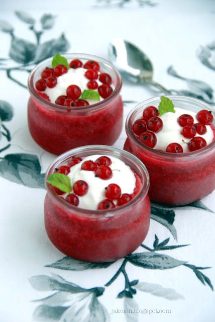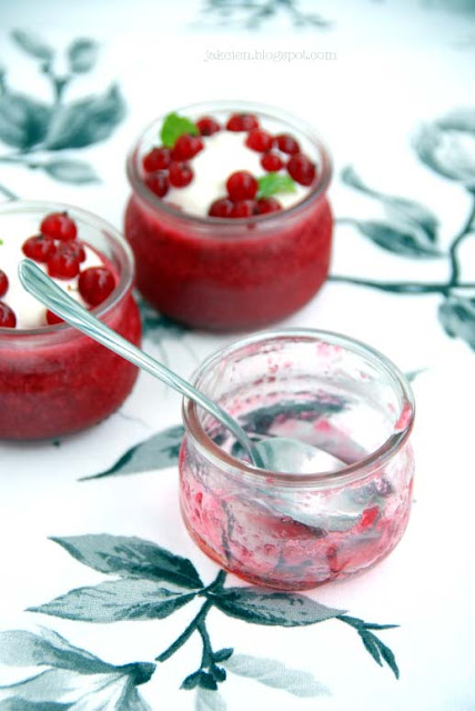 Galaretkę rozlałam do słoiczków i odstawiłam na noc do lodówki aby stężała. Przed podaniem udekorowałam owocami, bitą śmietaną i listkami mięty. Deser jest intensywny i mocno słodki, można więc nieco zredukować ilość cukru, licząc się z tym, że galaretka nie będzie miała tak zwartej konsystencji. Według mnie najlepiej smakuje na świeżo (można przygotować ją z mrożonych porzeczek). Nadaje się też do zapasteryzowania na zimę.