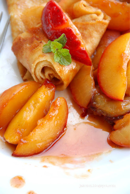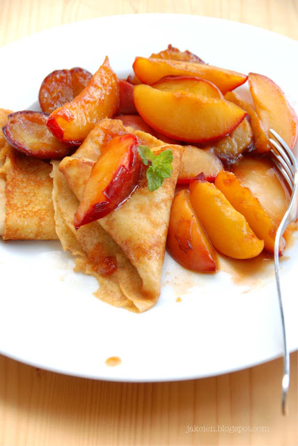 Przebojem tego lata są naleśniki z morelami, brzoskwiniami albo śliwkami w karmelu. Jadłam je na śniadanie, obiad i kolację. Są znakomite na szybki deser. Do jego przygotowania świetnie sprawdzą się renklody, które teraz królują na straganach. Ważne by wybrać dojrzałe ale jeszcze dość twarde owoce, które nie rozpadną się podczas karmelizowania. Takie naleśniki można podać z bitą śmietaną albo z jogurtem naturalnym. Kto raz spróbuje ten nie poprzestanie na jednym.