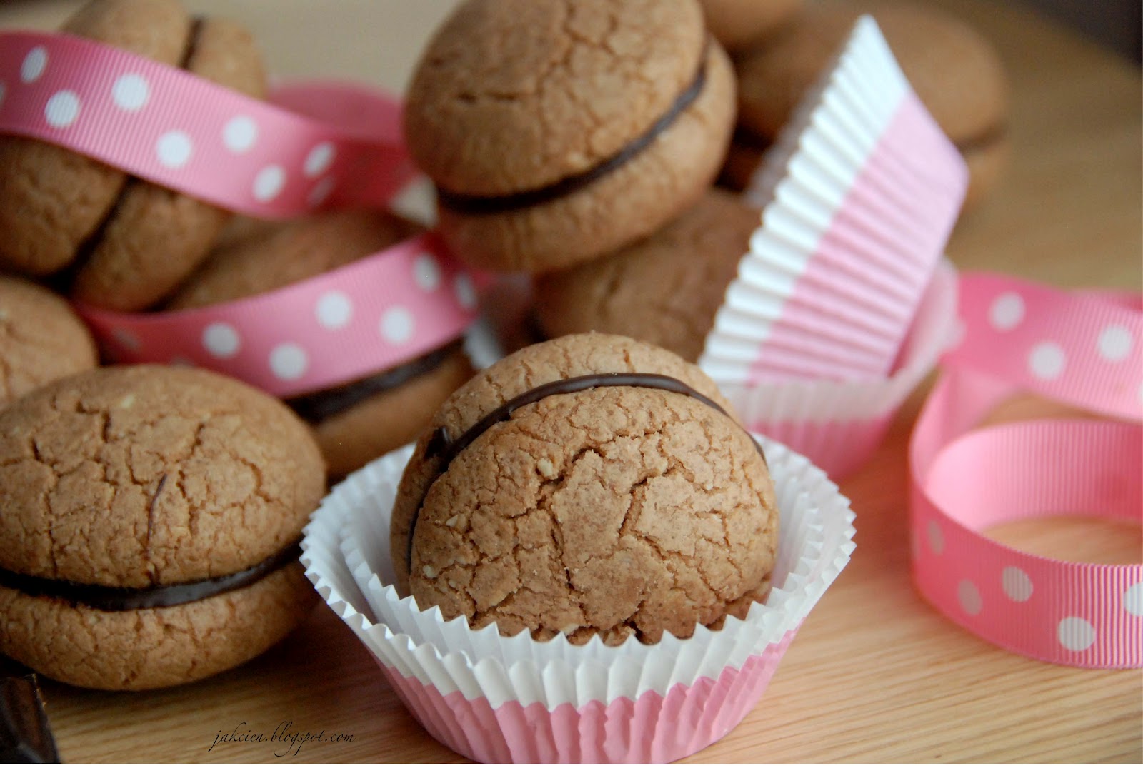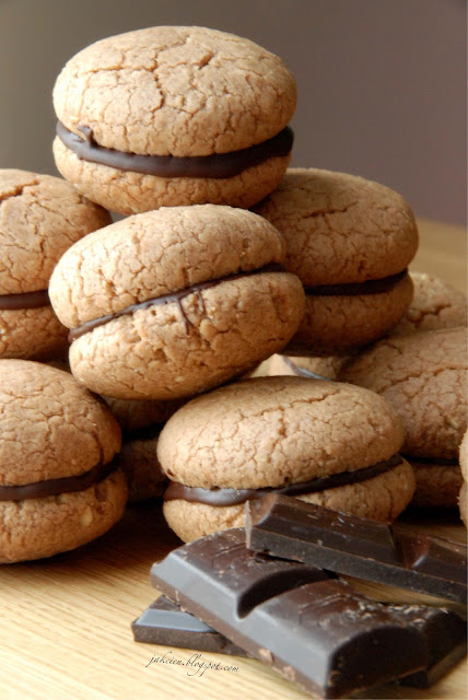 Dzisiejsze ciasteczka w smaku nie przypominają lekkich makaroników, choć wyglądają nieco podobnie. Do migdałowego ciasta dodałam roztopioną czekoladę. Aby podkreślić ich charakter dodatkowo przełożyłam je gorzką czekoladą. Tym przepisem dołączam się do czekoladowego weekendu.