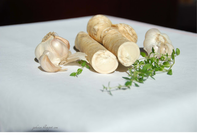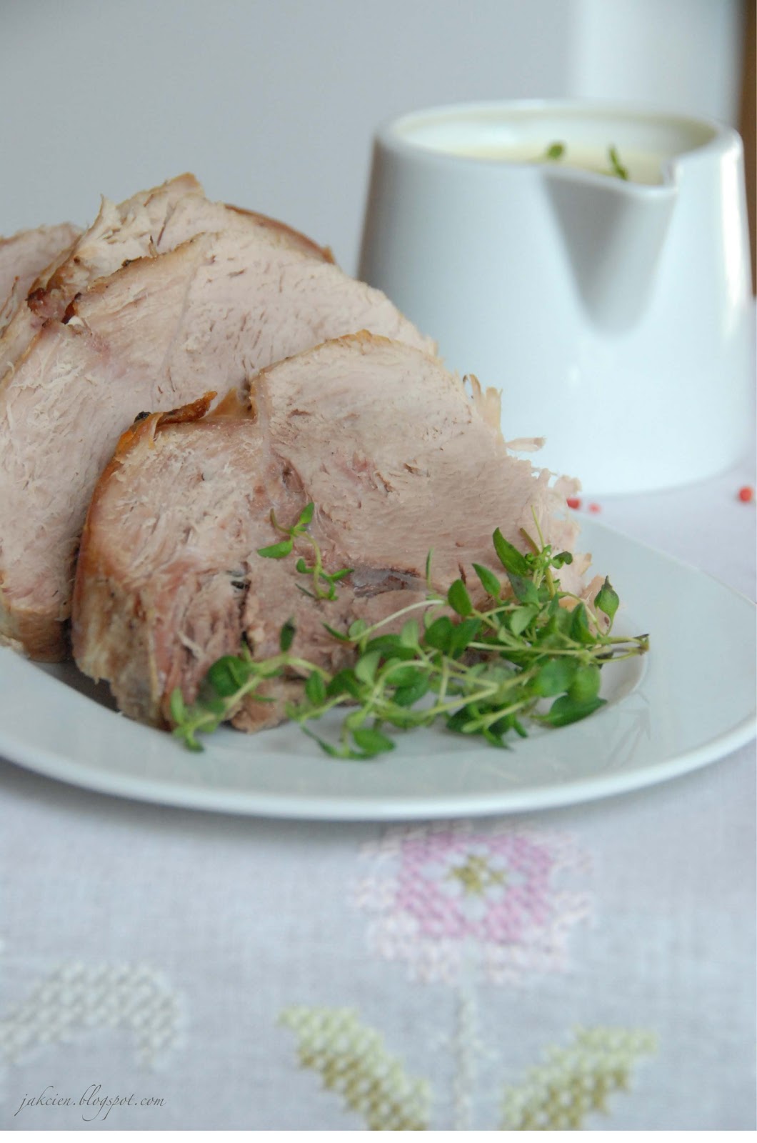 Szynkę nakłuwamy ostrym nożem i w nacięcia natykamy ćwiartki czosnkowych ząbków owinięte w słoninkę albo boczek. Mięso nacieramy solą, pieprzem oraz drobno posiekanymi listkami tymianku i odstawiamy do lodówki na kilka godzin (około 3-4). Natarte przyprawami mięso pędzlujemy delikatnie olejem (użyłam rzepakowego). Szynka jest chudym mięsem i odrobina oleju zapobiega nadmiernemu wysuszeniu w pierwszych minutach pieczenia. Tak przygotowaną szynkę pieczemy w rękawie, w piekarniku nagrzanym do temperatury 200 stopni. Czas pieczenia zależy od wielkości szynki. Tradycyjna szkoła każe piec mięso przynajmniej godzinę, na każdy kilogram. Do tego czasu dodałam 30 minut, gdyż nie obsmażałam szynki przed pieczeniem. Rękaw zostawiłam zamknięty aż do samego końca, mięso się delikatnie zrumieniło ale nie straciło całej wilgoci i soczystości. Przed podaniem odczekałam chwilkę i pokroiłam szynkę w spore plastry. Moim zdaniem z sosem chrzanowym można podawać również karkówkę pieczoną w ten sam sposób albo na przykład szynkę z solanki.