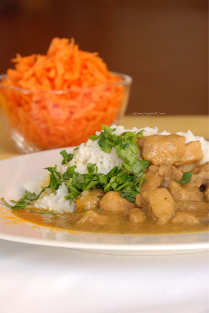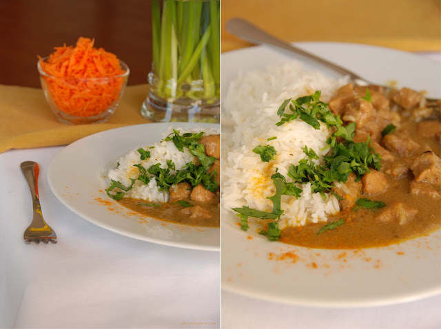Curry to przede wszystkim sos: gęsty, aromatyczny i pożywny. Do curry serwuje się tylko steamed plain rice, czyli gotowany ryż bez przypraw, aby nie zabić subtelnego smaku. Najlepiej by był to ryż basmati, ryż który jest wśród odmian ryżu tym czym szampan wśród win musujących. Szlachetne odmiana ryżu basmati jest uprawiana właśnie w Indii. Curry musi być świeże i przygotowane z najlepszych składników. Dzisiejsza potrawa pochodzi z prowincji Karnataka. Jest o tyle nietypowa, że przygotowana z wieprzowiny, rzadko jadanej w Indii z uwagi na dość licznych wyznawców islamu. W pandi główną rolę grają trzy składniki. Pierwszym jest delikatne mleko kokosowe, pochodzące z licznie rosnących w Karnatace palm kokosowych. Nadaje ono potrawie słodycz i kremową konsystencję. Drugim jest papryczka chili, nadająca pikantnego smaku i wyrazistości. Trzecim ale ważnym składnikiem jest pasta z tamaryndowca, której pandi zawdzięcza kwaskowaty smak. Owoce tamaryndowca mają w Indii różnorakie zastosowanie. Używa się ich do barwienia tkanin, przygotowania napojów chłodzących ale też wielu potraw. Do tego curry nadaje się blok z tamaryndowca, który trzeba uprzednio namoczyć w ciepłej wodzie. Można go kupić w dobrych sklepach z żywnością azjatycką. Jest on ważnym jeśli nie najważniejszym składnikiem tego curry. Curry zagęszczone jest pastą z karmelizowanej cebuli. Poza tym pandi zawiera właściwie niewiele przypraw: kurkumę, pieprz, kmin rzymski i gorczycę. Spróbujcie, pandi smakowało wszystkim których nim częstowałam.