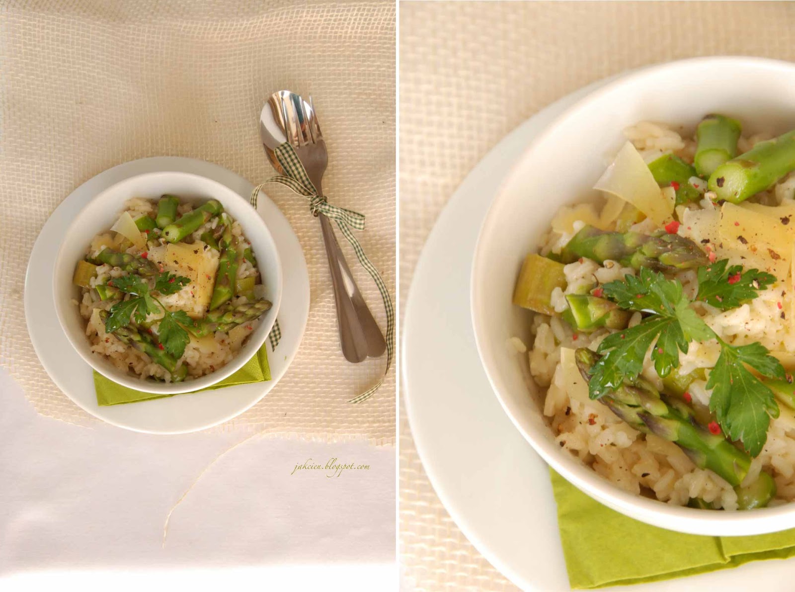 Na patelni podgrzałam oliwę i zezłociłam na niej cebulkę pokrojoną w bardzo drobną kostkę. Do cebuli dodałam czosnek przeciśnięty przez praskę i podsmażałam tylko do momentu, w którym oddał swój aromat. Na patelnię dorzuciłam wtedy ryż i zeszkliłam go krótko po czym zalałam filiżanką gorącego bulionu i przykryłam. Ryż podgrzewałam na patelni tak długo aż wchłonął bulion i uzupełniałam kolejnymi jego porcjami aż ryż stał się miękki ale nie rozpadał się. Do risotto nadają się odmiany ryżu o krótkim ziarnie, są uprawiane przeważnie w chłodniejszym klimacie i zawierają dużą ilość skrobi. Risotto jest dzięki skrobi i pektynom kleiste, choć ryż wcale nie musi być rozgotowany. Na sam koniec do risotto dodałam utarty na drobnych oczkach parmezan. Można użyć innego twardego sera dobrej jakości, pod warunkiem, że jest on aromatyczny. Ser sprawi, że risotto będzie kremowe i delikatne ale też pożywne. Na sam koniec risotto posoliłam i dodałam pieprz oraz szparagi, które wcześniej blanszowałam 5 minut w osolonej wodzie główkami do góry (zwinięte w pęczek). Szparagi pokroiłam w kawałki około 2 cm a główki zostawiłam dłuższe i dodałam po wymieszaniu, na sam koniec. Risotto podawałam z parmezanem pokrojonym w płatki i odrobiną oliwy truflowej, przybrane natką z pietruszki.