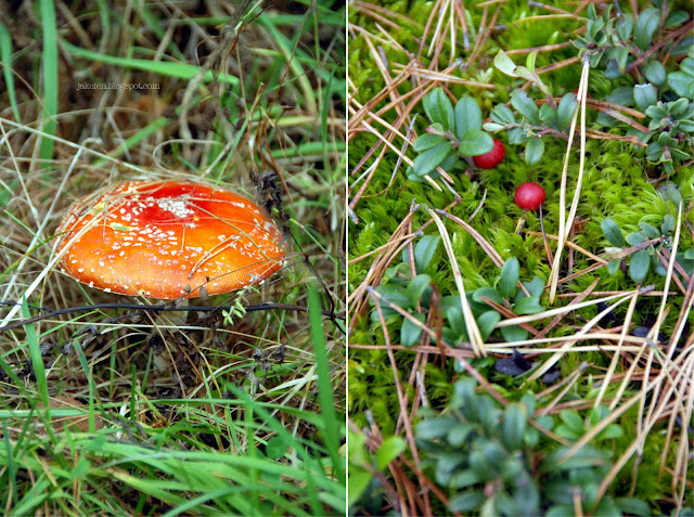 Na skraju Puszczy Piskiej, w małej wsi Pilchy, w starej szkole przerobionej na stację badawczą zaskoczyła nas zima. Posypała śniegiem na jeszcze żółte brzozy, na kwiaty koniczyny, krwawnika i na zieloną trawę. Jeszcze w sobotę zbieraliśmy grzyby i borówki. Szukałam jesieni, która miała kolor czerwonych plam na tle brązowego krajobrazu. A to jak nakrapiane muchomory albo jak boje na jeziorze, a to jak pomarańczowa miechunka na polu albo borówki brusznice. Widać to na moich zdjęciach.