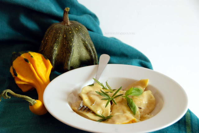 Moje dzisiejsze mają formę tradycyjnych pierogów, ale smakują tak samo jak tortelli z dynią i ricottą. Podaje się je z sosem maślanym i świeżymi ziołami: rozmarynem, szałwią i bazylią. W domu robiłam je już z dynią makaronową i bardziej wyrazistą hokkaido. Polecam obie, choć dynię makaronową trzeba długo redukować, aby farsz nie był zbyt płynny.